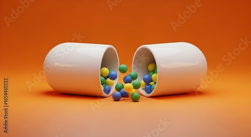Vibrant colorful spheres spill from an open white capsule, symbolizing medicine, health, and wellness on a warm orange background