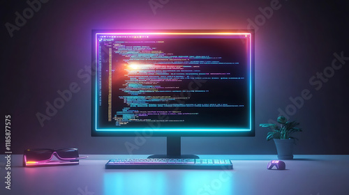 computer, monitor, game, code, programming, technology, neon, goggles, keyboard, plant, desk, workspace, digital, screen, software, development, coding, modern, colourful, light, creative, futuristic, electronic, home office, gaming, interface, design, innovation, aesthetic, visual