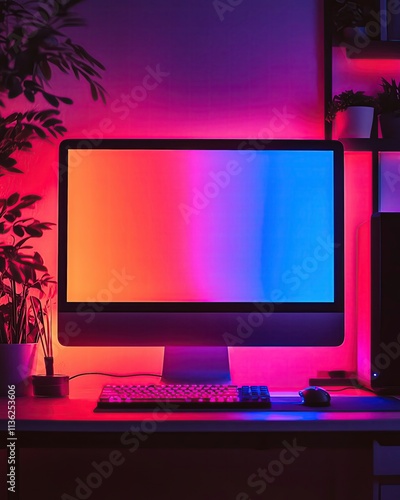 vibrant, computer, setup, colourful, light, keyboard, monitor, lamp, desk, furniture, style, space, art, bright, cable, zone, decor, hub, smart, device, chair, office, modern, design, paint, shelf, gear, station, tape, workspace