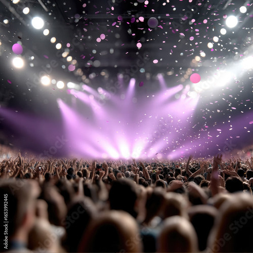 Vibrant concert scene with cheering crowd, purple stage lights, confetti, and energetic atmosphere at indoor music event