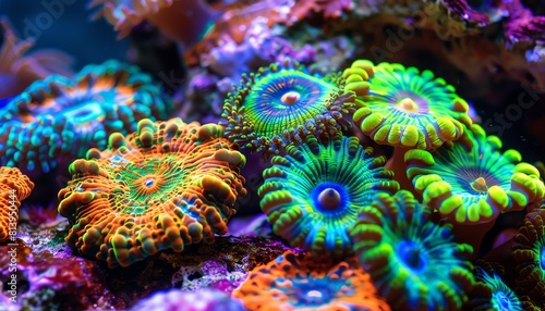 Vibrant corals in rich hues, spotlight effect, undersea rock base, macro shot, detailed texture visible