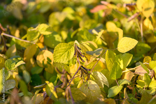 Vibrant crop detail, Mature plants under morning sun, Lush soybean plants with pods and leaves, Closeup of soybean canopy indicating harvest readiness and health