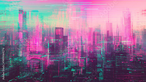 city, futuristic, neon, pink, teal, glitch, digital, abstract, urban, skyline, skyscraper, glowing, distorted, surreal, illumination, noise, bright, vibrant, landscape, tower, texture, digital artwork, city landscape, technology, pattern, design, light, illustration, art, texture, wallpaper