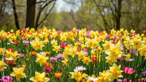 Vibrant daffodil flowers blooming in a lush green field under the warm sun, flora, growth, nature