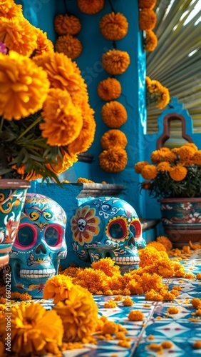 Vibrant Day of the Dead Skulls and Marigolds Display