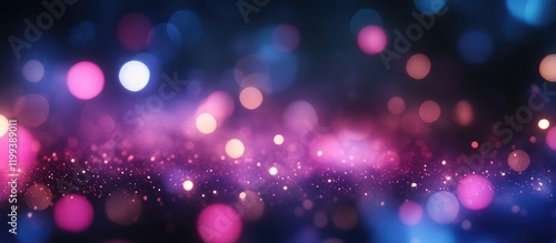 Vibrant defocused purple and blue fireworks with shimmering bokeh lights in the night sky creating a magical atmosphere and space for text