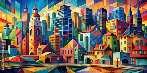 Vibrant digital painting of a cityscape in cubism style, featuring geometric shapes, bold lines, and saturated colors, depicting urban architecture in a stylized abstract form.