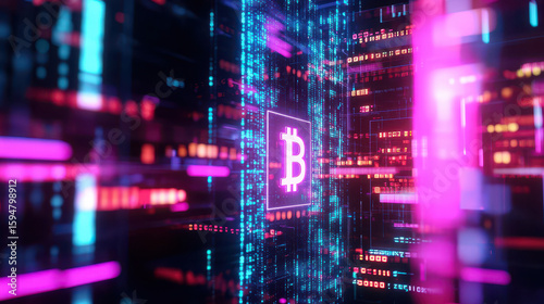 Vibrant digital representation of Bitcoin symbol surrounded by glowing data streams, showcasing technology and finance