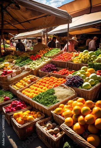 vibrant display colorful fresh produce featuring varieties fruits vegetables abundant market setting, apples, basket, berries, bright, carrots, citrus