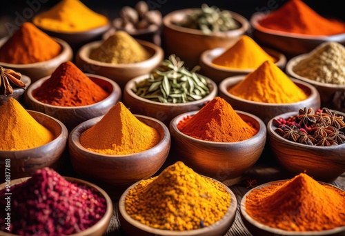 vibrant display colorful spices showcasing rich textures diverse patterns rustic wooden surface, aroma, artisan, artistic, arrangement, bowl, bright