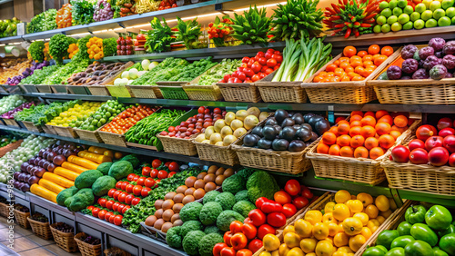 Vibrant display of fresh fruits and vegetables in a supermarket , colorful, fresh, vibrant, produce, healthy, organic