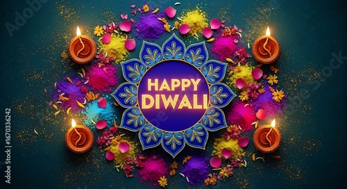 Vibrant Diwali design featuring candles, flowers, and colorful powder. Perfect for festive greetings, invitations, cultural events, and religious celebrations.