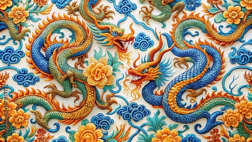 Vibrant Dragon Pattern with Intricate Designs Featuring Colorful Blue and Orange Dragons Wrapped Around Floral Elements in a Minimalist Style