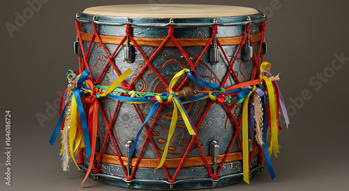Vibrant drum, adorned with colorful ribbons, textured surface, musical expression, cultural celebration.