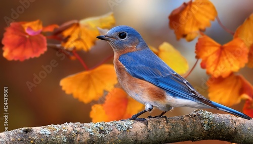 Vibrant Eastern Bluebird Perched Gracefully on an Autumn Branch, Amidst the Warm Colors of a Fall Scene on a Clear Day Perfect for Digital Art, Home Decor, or Design Inspiration.