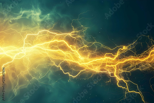 Vibrant electric lightning bolt illuminating a dark blue background with dynamic energy flow