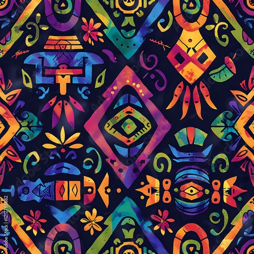 Vibrant ethnic seamless pattern with colorful tribal motifs and geometric shapes on dark background. Perfect for fabric, wallpaper and surface design projects.