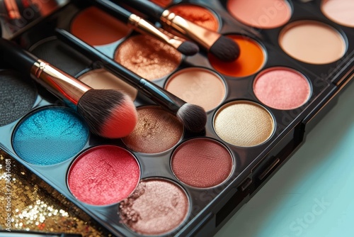 cosmetic, eyeshadow, pallette, indoor, powder, palette, brush, make-up, beauty, vibrant, artistic, colourful, blend, shimmer, creativity, application, texture, luxurious, high-end, glamourous, professional, flawless, glossy, elegance, trendy, stylish, radiant, transformation, enchanting, bold, precision, versatile, gradient, aglow, edgy, captivating, surreal, expressive, modern, youthful, sophisticated, imaginative