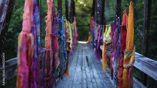 Vibrant fabric pieces hanging from the sides of a bridge seem to be reaching out and embracing the natural elements around them.
