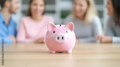 Vibrant Family Gathering Around Wooden Table with Piggy Bank Symbolizing Saving and Togetherness