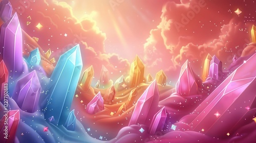 crystal, landscape, fantasy, colourful, sunset, dreamy, nature, vibrant, sky, light, beauty, scenery, mineral, sparkle, magical, art, cloud, pink, blue, yellow, purple, shine, illumination, depth, adventure, exploration, surreal, enchanting, aethereal, whimsical, tranquil, artistic, majestic, atmospheric, peaceful, serene, striking, dynamic, imaginative, high-coloured, radiant, captivating, breathtaking, picturesque, alluring, charming, mystical