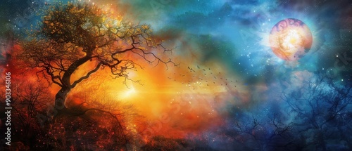 fantasy, landscape, vibrant, colourful, sky, tree, majestic, glowing, planet, dreamlike, surreal, nature, mystical, aethereal, imaginative, scenery, artistic, digital, illustration, fantasyland, cosmos, universe, celestial, dreamscape, beauty, wonder, magic, enchantment, atmosphere, creative, abstract, picturesque