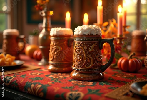 vibrant festive beer steins displayed richly colored tablecloth traditional celebration table setting, glass, drink, homebrew, tasting, ceramic, craft