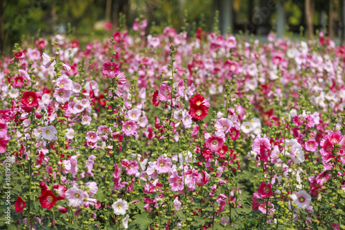 Vibrant field of pink and red hollyhocks full bloom creates lively and colorful scene. tall flowers stand proudly, showcasing their delicate petals against lush green backdrop, evoking sense