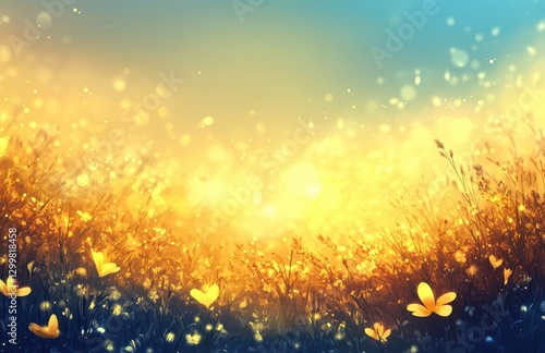Vibrant Field of Yellow Butterflies and Flowers Under a Soft Glow of Golden Light During a Beautiful Sunrise in Nature's Tranquil Setting