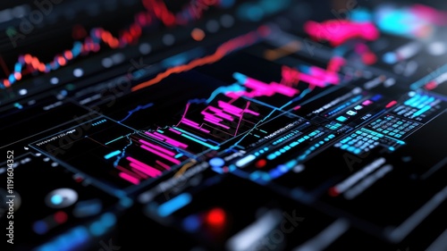 Vibrant financial chart with glowing lines and data points on digital screen, displaying activity
