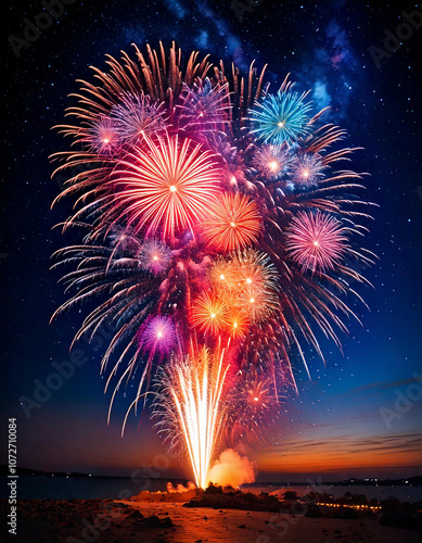 Vibrant fireworks display lighting up a colorful night sky celebrating with bursts of light and stars