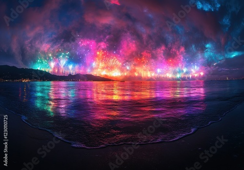 Vibrant Fireworks Display Over Serene Ocean during Nighttime with Glowing Reflections Beneath a Colorful Sky and Spectacular Light Show