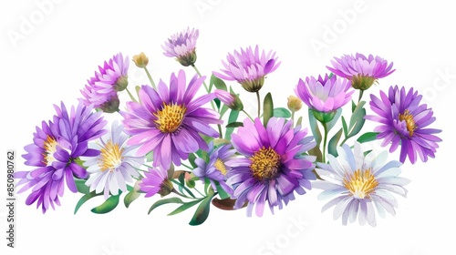 flower, aster, watercolor, illustration, purple, white, background, arrangement, spring, decor, floral, bouquet, vibrant, colourful, beautiful, delicate, artistic, whimsical, nature, garden