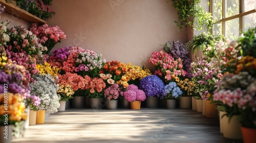 Vibrant Floral Arrangement in a Sunlit Room with Colorful Blooms and Lush Greenery on Shelves