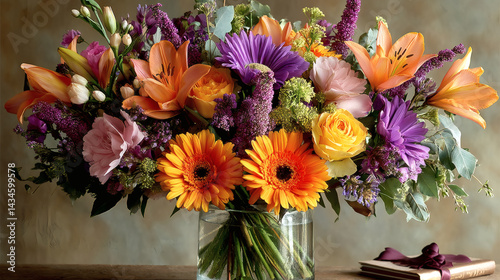 flower, arrangement, vase, colourful, nature, flower petals, beauty, decoration, bloom, fresh, floral, design, elegant, artistry, background, green, orange, purple, yellow, pink, gerbera, lily, rose, lilac, aesthetic, table, bouquet, gift, event, party, celebration, spring, summer, landscape, photo, still life, home, indoor, natural, organic, texture, vibrant, decorative, seasonal, cheerful, stylish