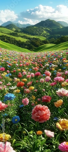 Vibrant flower blooming event in rolling hills nature scene bright day panoramic view spring beauty