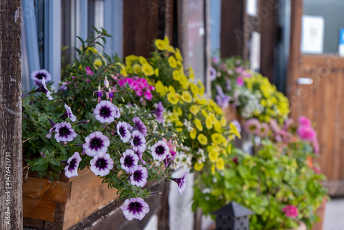 floral, greenery, blooming, colourful, flower, outdoors, charming, bloom, botanical, garden, plant, decor, decoration, lively, high-coloured, beautiful, bright, fresh, exterior, scenery, petunia, spring, tranquil, ambience, joy, pink, landscape, urban, purple, serene, seasonal, inviting, artistic, aesthetic, rural, yellow, design, detail, summer, artistry, wooden, colours, nature, contrast, style, home, atmosphere, window, hanging
