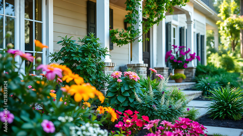 Vibrant Flower Garden Landscape at a Beautiful Home. Colorful flowers, lush greenery, and charming house exterior create a stunning landscape design.
