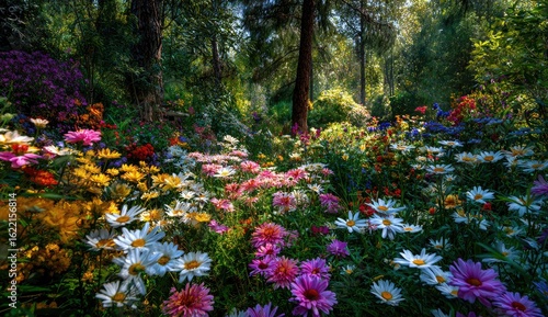 meadow, flower, colourful, vibrant, sunlight, forest, lush, garden, nature, blooming, spring, summer, beauty, plant, daisy, tree, path, bright, full, green, pink, purple, yellow, red, blue, white, foliage, floral, scenic, natural, peaceful, idylli, springtime, wild, abundant, colourful, pretty, exuberant, delightful, wonder