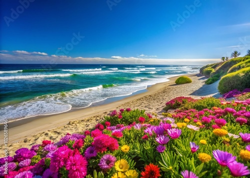 Vibrant Flowers Blooming on Sandy Beach with Gentle Waves and Clear Blue Sky for Nature and Travel Photography