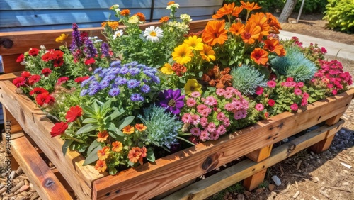 Vibrant flowers spill from a rustic wooden pallet transformed into a colorful garden planter in a sunny backyard, showcasing a creative and artistic repurposed decor.