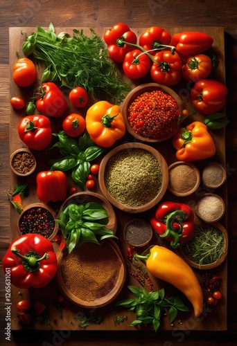 vibrant food ingredients displayed colorful textured backgrounds creating visually striking culinary experience, fresh, seasoning, spice, fruit, vegetable