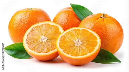 Vibrant fresh oranges and slices isolated on a white background, ideal for culinary uses and health benefits, enhancing dishes with flavor and nutrition effortlessly.