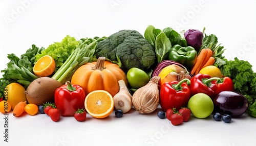 vibrant fresh vegetables and fruits on white background