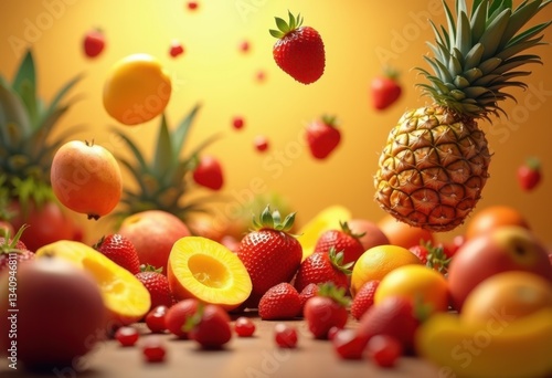 vibrant fruit display floating mid air rich colors soft lighting creating striking visual contrast, colorful, displays, shapes, textures, patterns