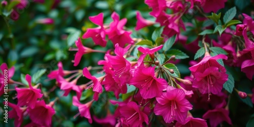 Vibrant fuchsia blossoms in full bloom, showcasing their intricate details against a backdrop of lush green foliage.