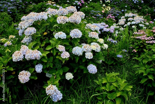 Vibrant garden filled with blooming hydrangeas in various shades of blue, pink, and white