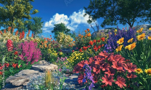 Vibrant garden scene with blooming wildflowers in vivid hues of red, yellow, and purple, captured under a bright blue sky