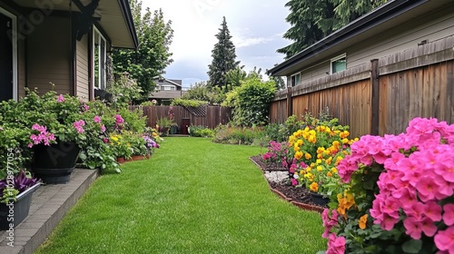 garden, flower, vibrant, greenery, colourful, plant, landscaping, nature, blossom, space, fence, pathway, lawn, decor, beauty, horticulture, spring, summer, sunshine, organic, blooming, flower petals, design, foliage, cultivation, bright, peaceful, backyard, floral, freshness, calmness, serene, natural, maintenance, colours, arrangement, flora, flowerbed, residential, environmentally friendly, aesthetic, environment