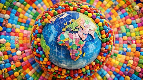 Vibrant globe surrounded by a kaleidoscope of colors, swirling together in a mesmerizing dance, symbolizing diversity, unity, and the beauty of our global community.